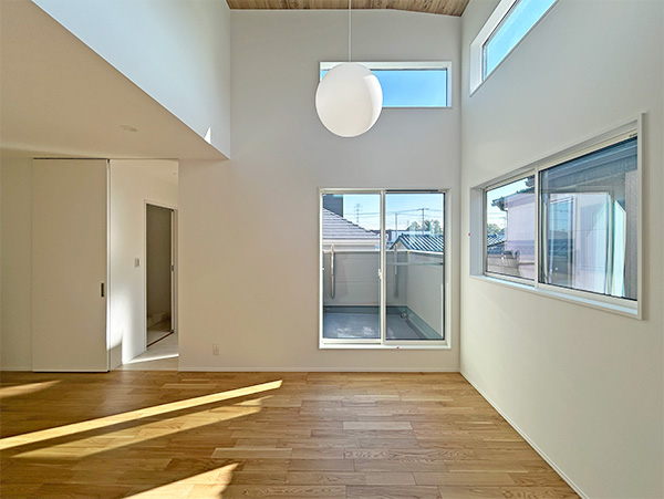 木目の天井がやさしい温もりを生み出す吹き抜けLDK。