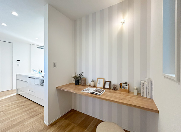 造作カウンターがあることで、洗濯物をその場で広げて畳んだり、アイロンがけをしたりと作業が快適に進みます。
