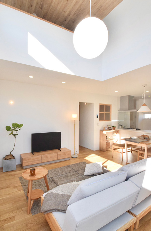 木目の天井がやさしい温もりを生み出す吹き抜けLDK。